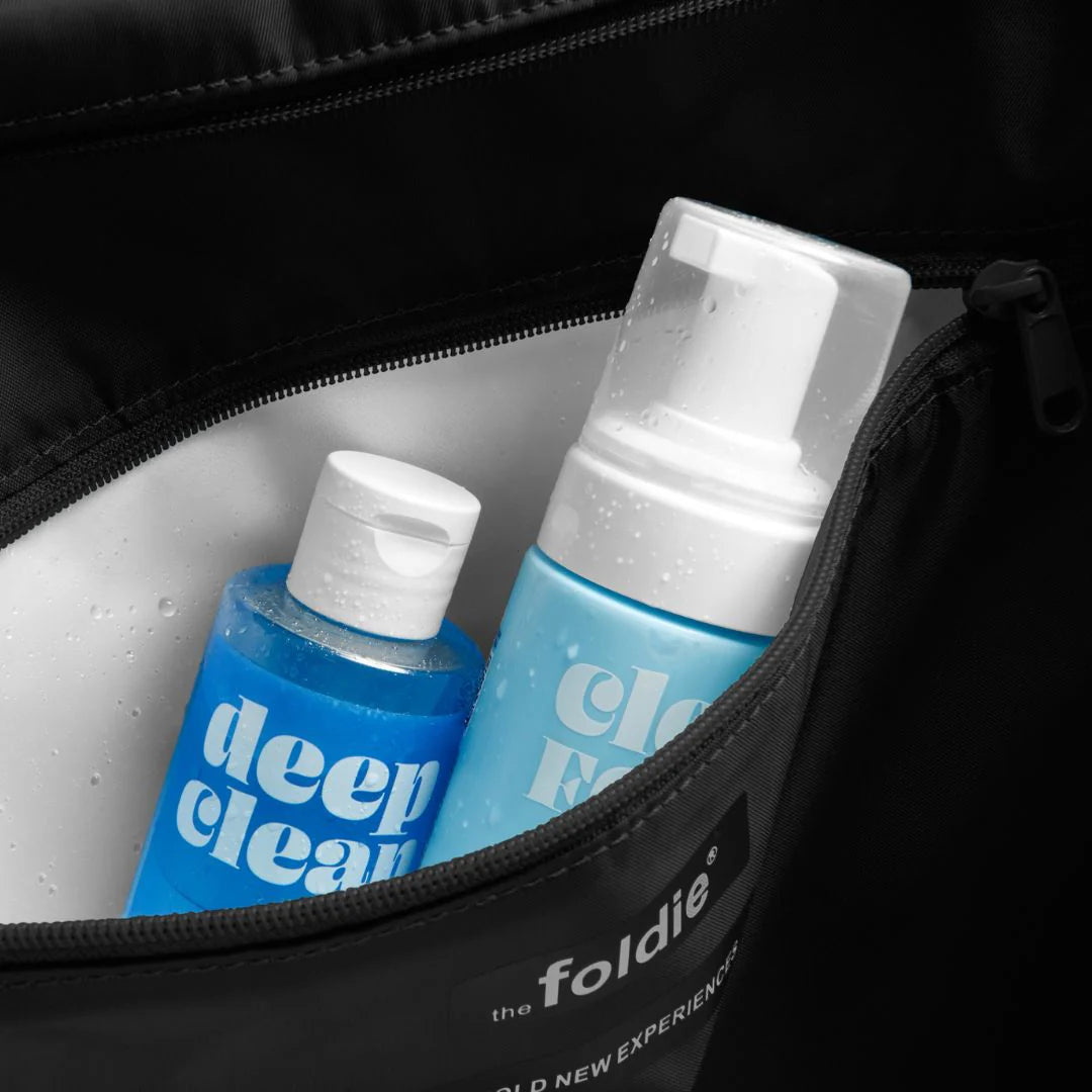 The Foldie folds down completely flat when you're done — no bulky bag to store. Open it up when you need space, fold it down when you don't.